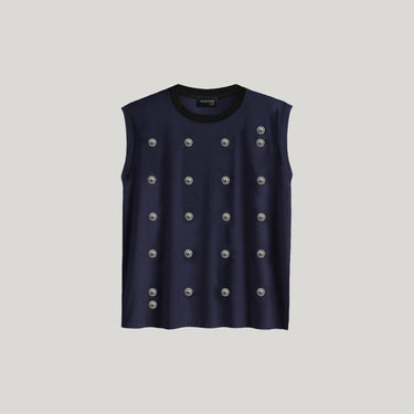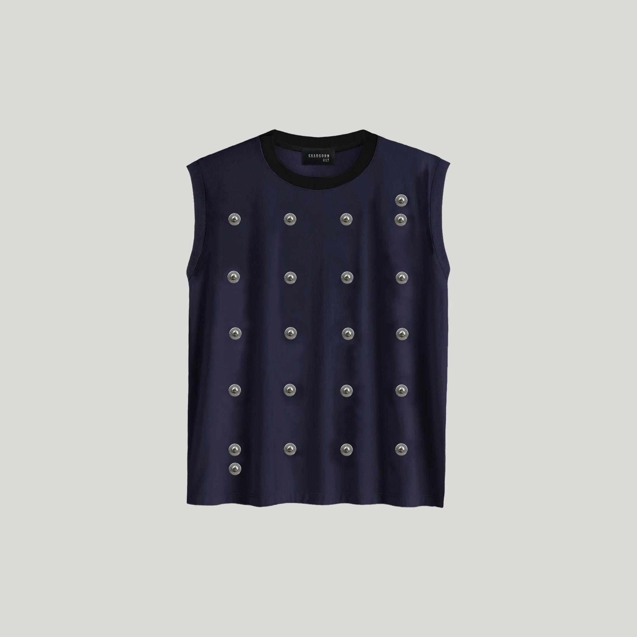 The lean vintage proportions and framing of TEE 50 has been modified to a sleeveless muscle tee in a slightly shorter length. Then amped up with an 'electric' network of steel. The crew neck is as always marked with the SKARGORN tooth. Power up.