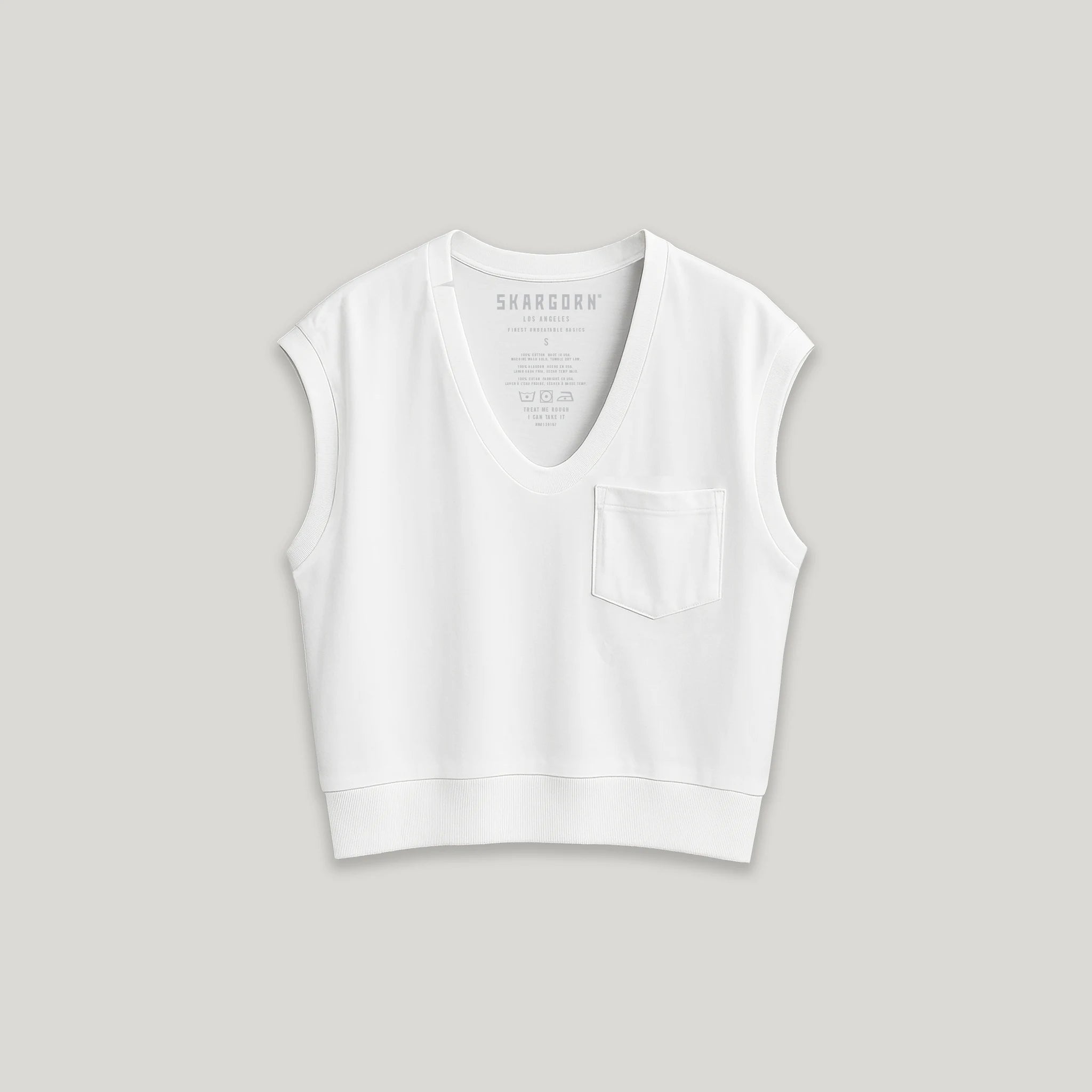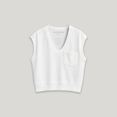 TEE 60 Bind . Easy volume and lowered ribbed armholes gives this tee sex appeal while being a comfortable nod to a classic pocket tee. The ribbed waistband ensures a gathered and finished look at the low waist. The SKARGORN tooth marks the neck.