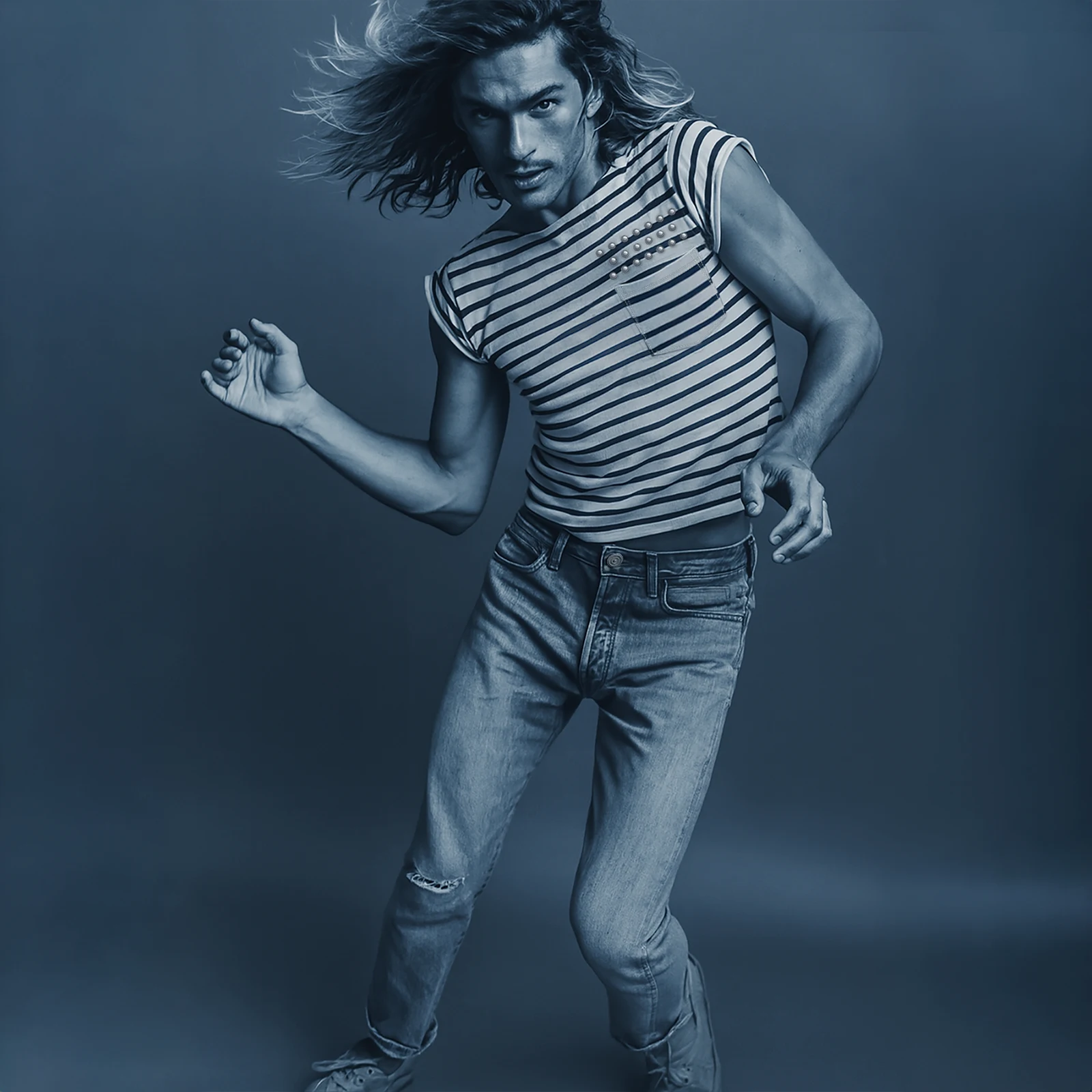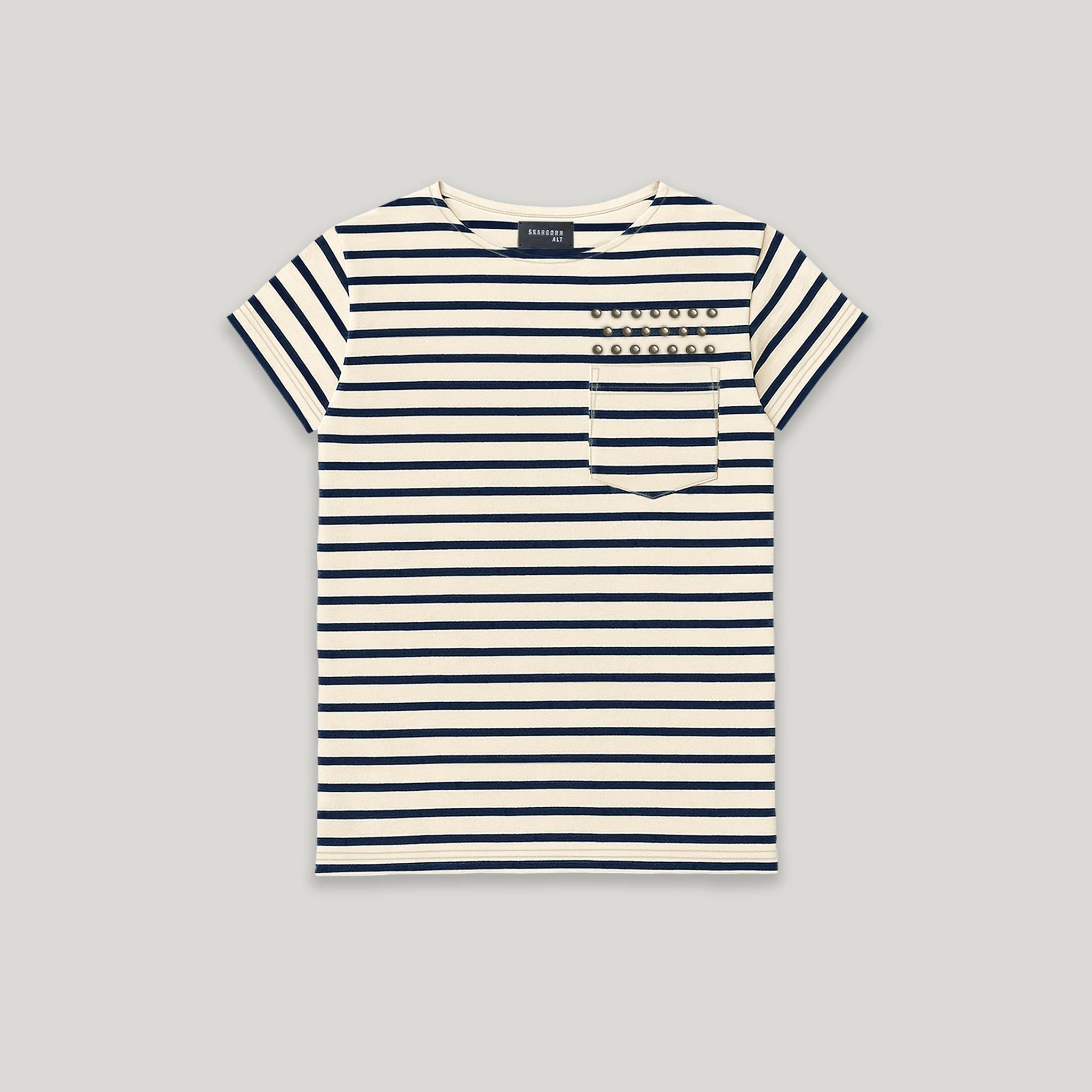 TEE 40 Defaced - Cut slim and short it can be worn revealing. Metal dome rivets hover over the pocket in honor of your grit. Finished with a classic open boat neck. Corruption of the classic - bare, broken, and bold. Wear it clean or clash it loud.