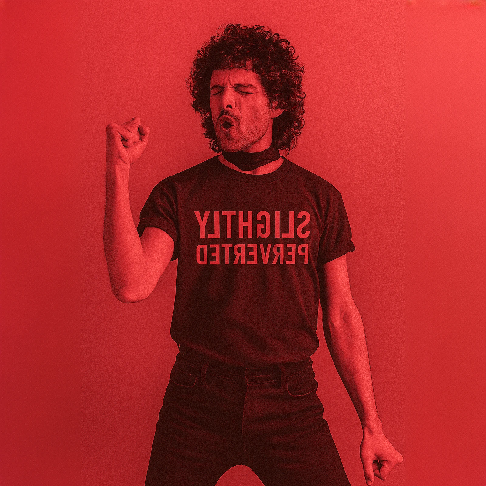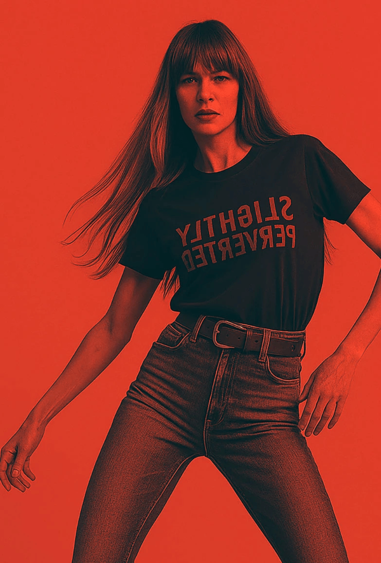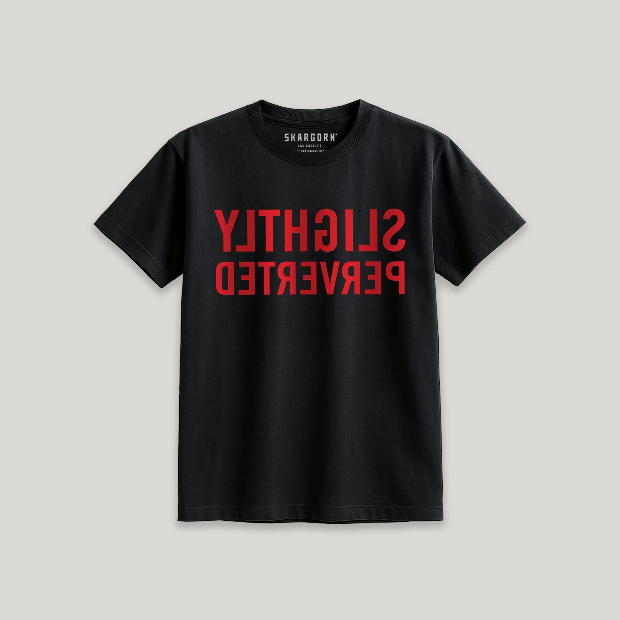 TEE 50 Charged . Slightly Perverted printed in rich red on an unapologetic, shoulder-framing and lean fitting tee. Hem hits the hip. The neckband is marked with the SKARGORN tooth. Sharp, bold, and built to push back. Tight or oversized, wear it your way.