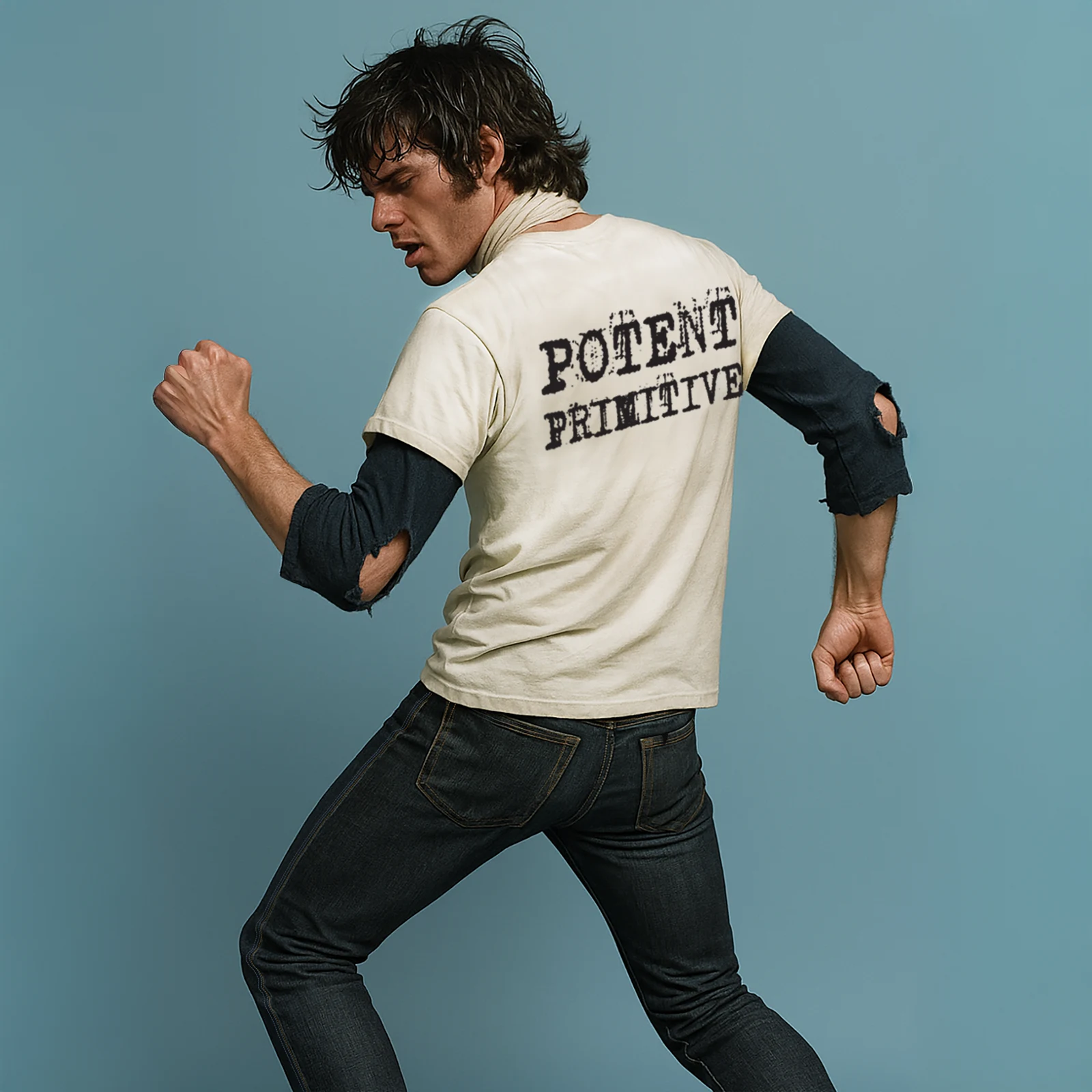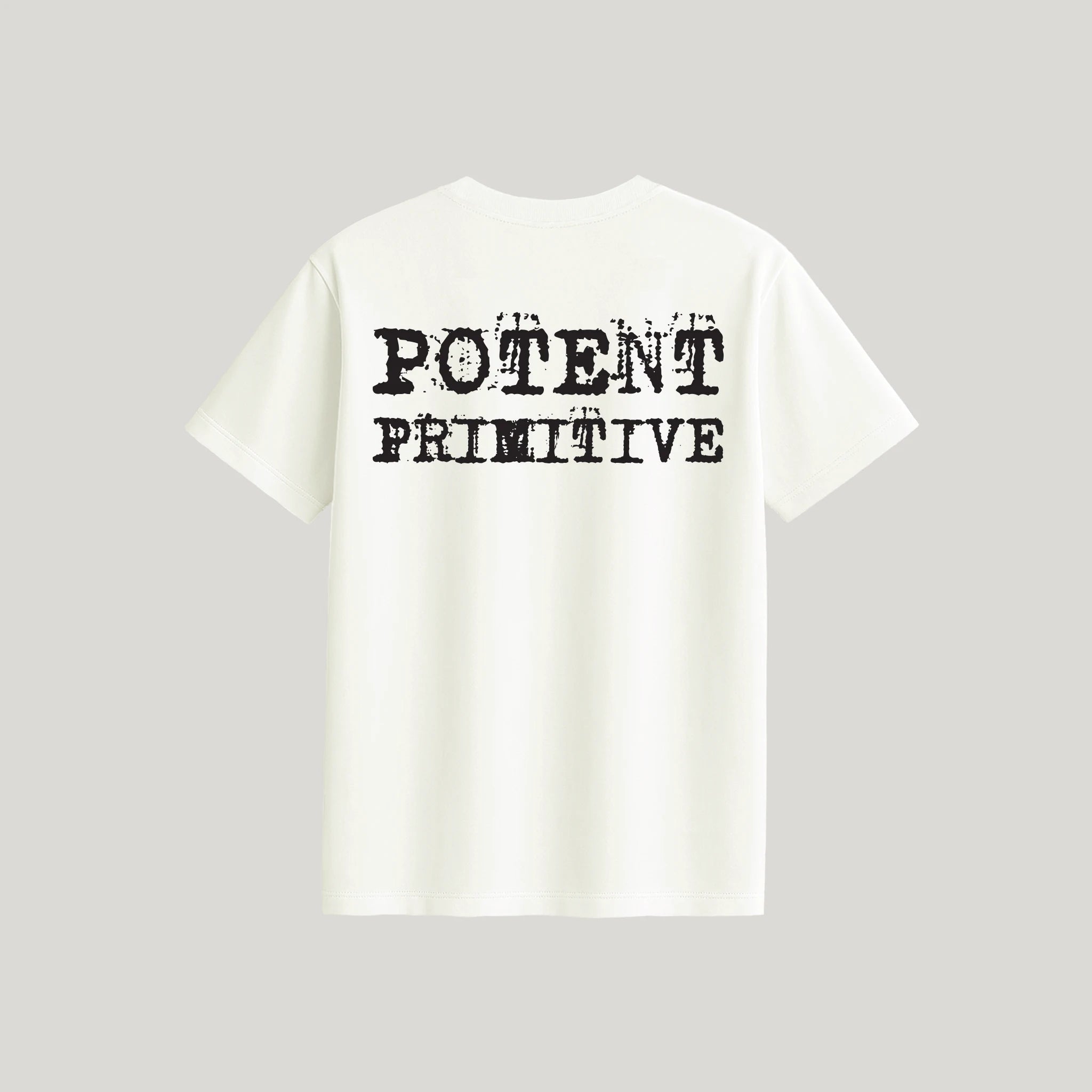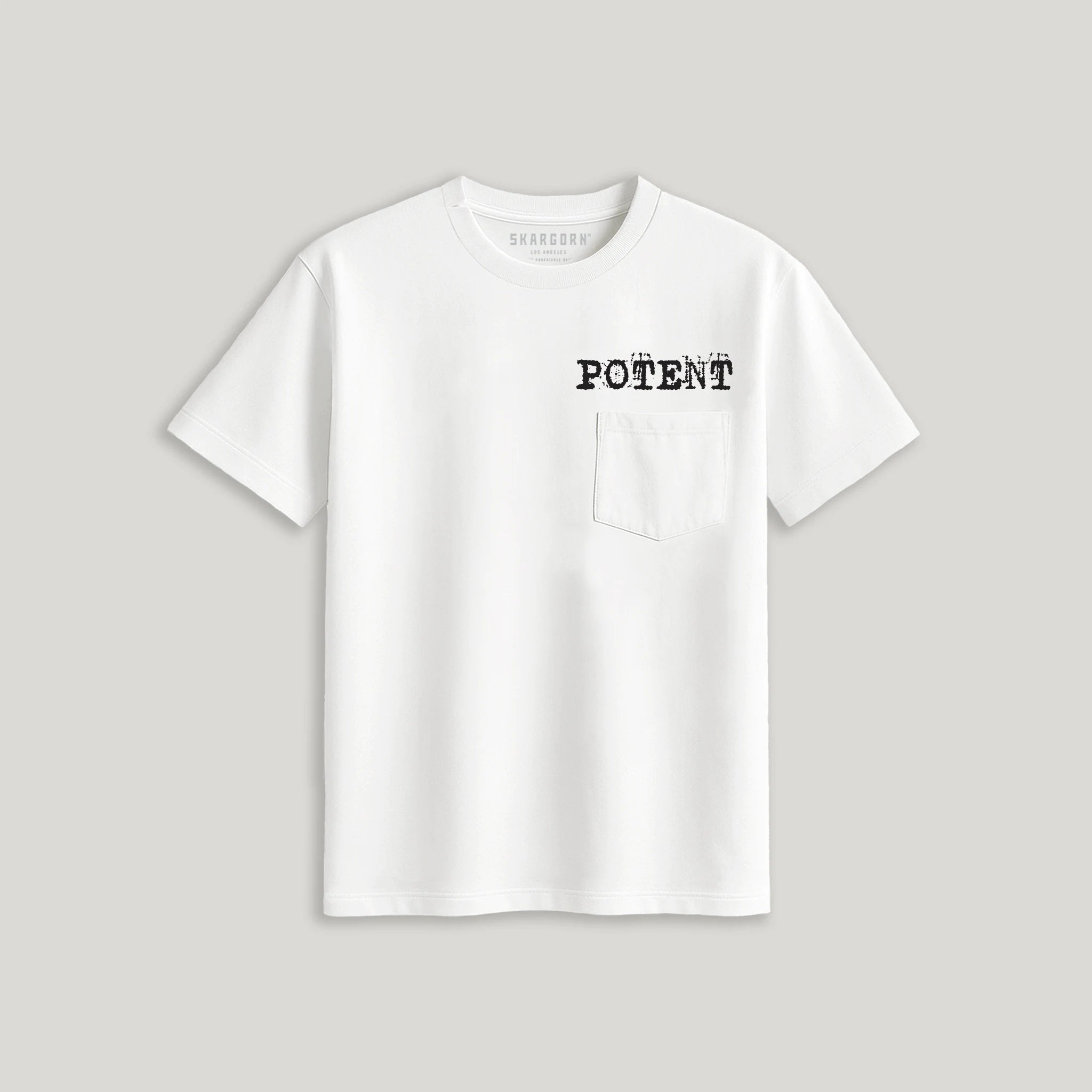 TEE 50 Press. POTENT printed in a messy typewriter font above the chest pocket, and a bigger POTENT PRIMITIVE on the upper back. Both printed in black waterbase ink on our shoulder-framing, and lean fitting pocket tee with a neckband marked by the SKARGORN tooth. The length hits clean at the hip. Tight or oversized, wear it your way.
