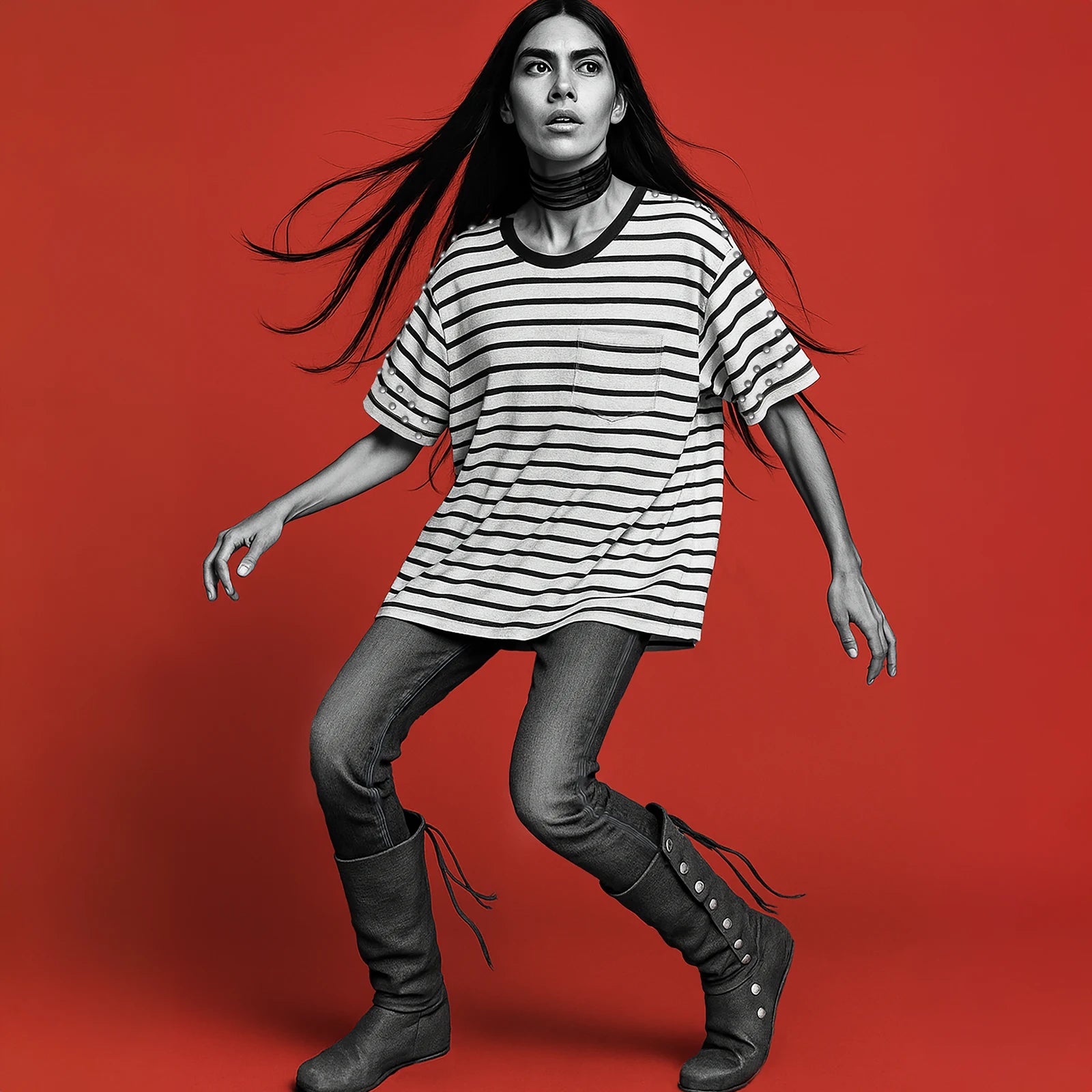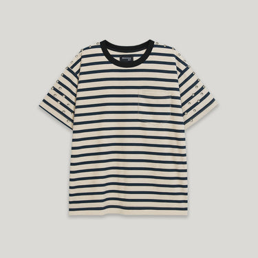 TEE 58 Rogue - A relaxed cut tee with easy dropped shoulders and elbow length sleeves. The hem is straight and hits mid hip. Classic stripe in cream and navy cotton jersey with a black neck band featuring the SKARGORN tooth. Dome studded upside-down chevrons on both shoulders and sleeves. Tradition disrupted. Distress revealed.