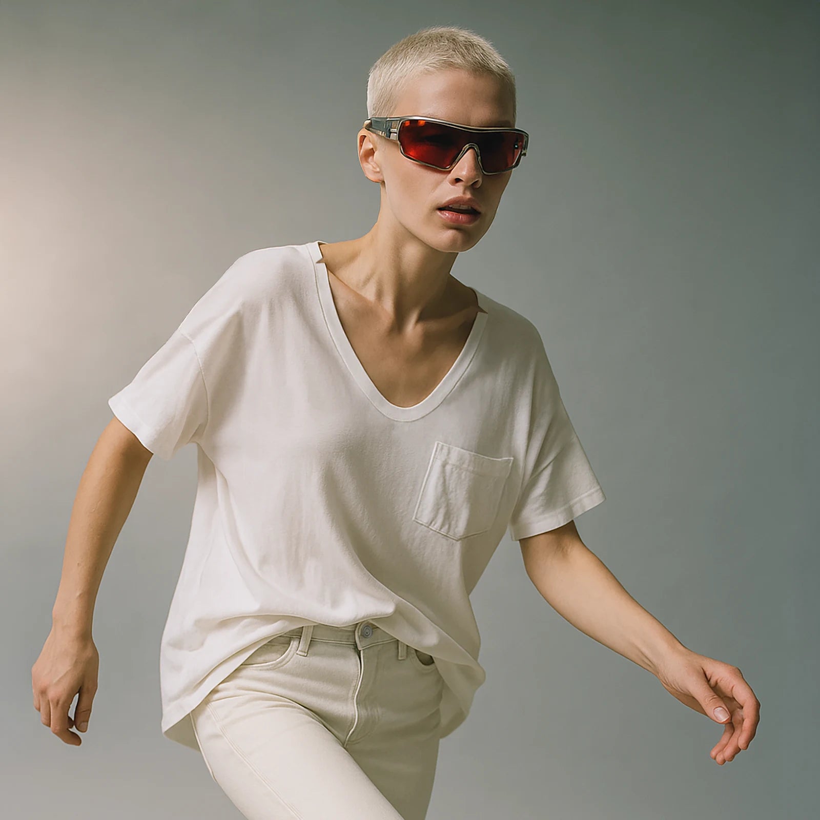 TEE 61 Deep - A bold wide cut with a deep soft V gives you sexy volume that drapes with flattery. Very dropped shoulders and a lean short sleeve. High hip length and sides that drop with the wide cut. The SKARGORN teeth mark your clavicles.