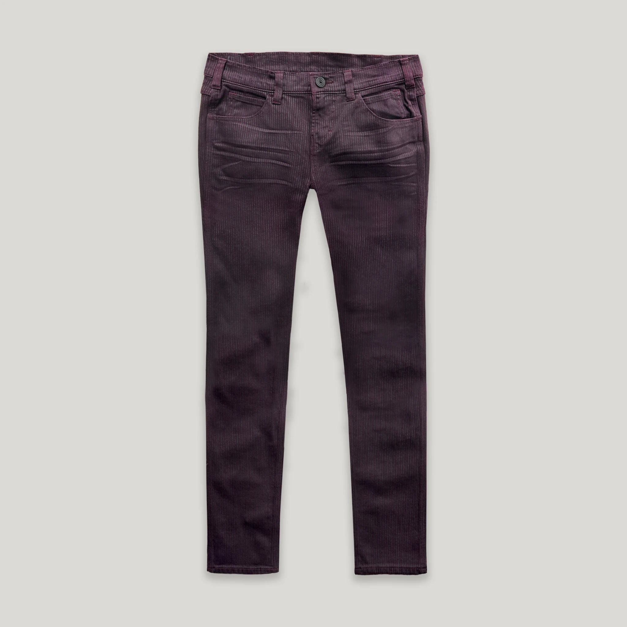 JEAN 77 Thorn . Gore - Black pin stripes on a lush wine colored denim. Mid-rise, zip fly, ankle crop, low sitting tapered fit with attitude. Triple-stitched, and finished with black metal button and leather Jean 77 patch.